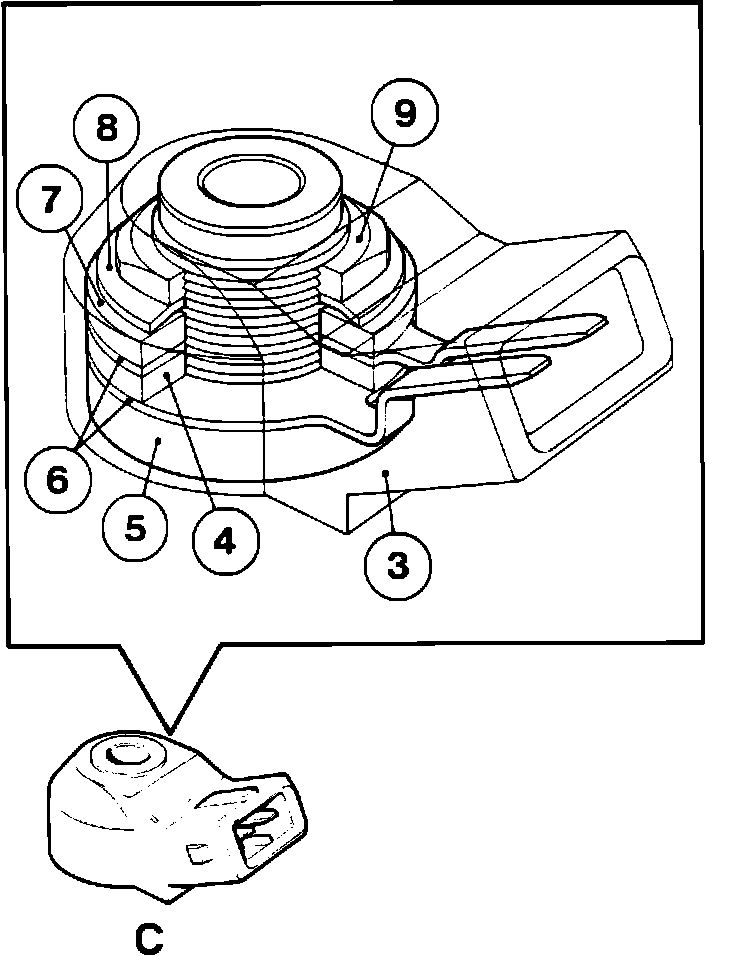 (C) The knock sensor, consists of a (3) housing a (4) piezoelectric crystal mounted on a (5) threaded sleeve between (6) two connector strips. One side of the assembly is fitted with a (7) damping weight and (8) spring washer secured by a (9) nut.
