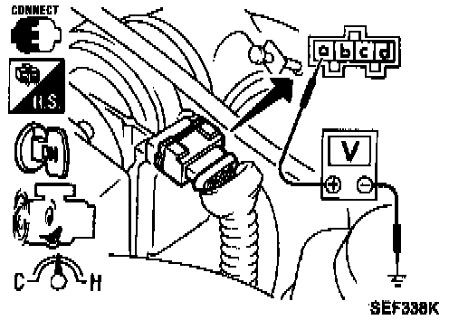 ^ With the ignition switch "ON" (Engine stopped), there should be: Approximately Less than 1.0 Volts DC.