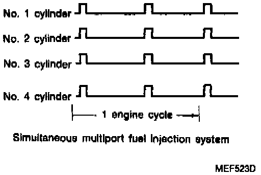 Fuel is injected simultaneously into all four cylinders twice each engine cycle. In other words, pulse signals of the same width are simultaneously transmitted from the ECM. The four injectors will then receive the signals two times for each engine cycle.