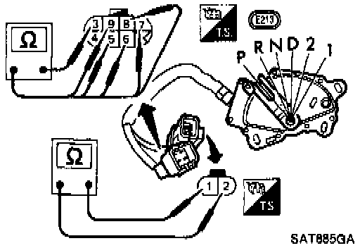 1. Check continuity between terminals (1) and (2) and between terminals (3) and (4), (5), (6), (7), (8), (9) while moving selector lever through each range. There should be continuity in each combination.