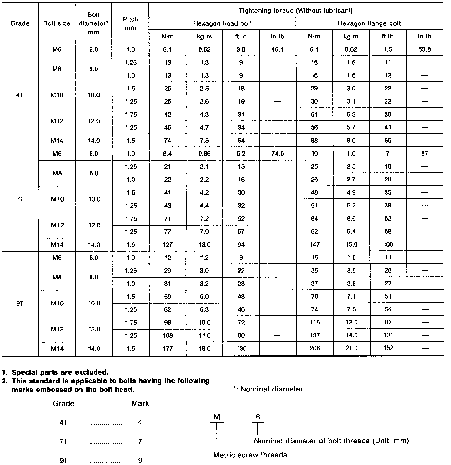 Tightening Torque Of Standard Bolts: