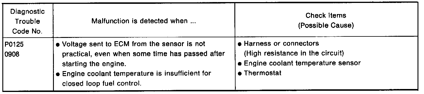 NOTE: If both DTC P0115 (0103) and P0125 (0908) are displayed, first perform TROUBLE DIAGNOSIS FOR DTC P0115.