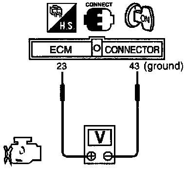 2) Check the voltage between Engine Control Module (ECM) terminal (23) and (43) (ground) and check the followings: