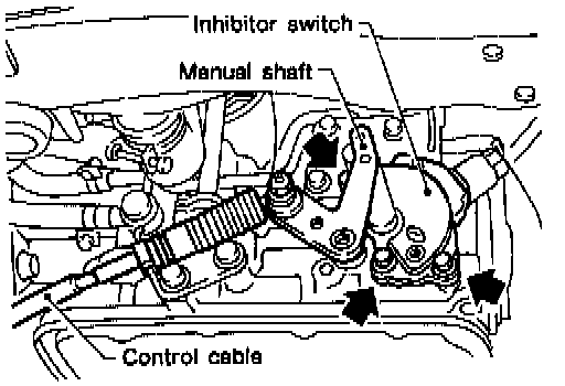 4. Insert 4.0 mm (0.157 in) dia. pin into adjustment holes in inhibitor switch and manual shaft. Insert the pin so that adjustment holes are correctly aligned with each other.