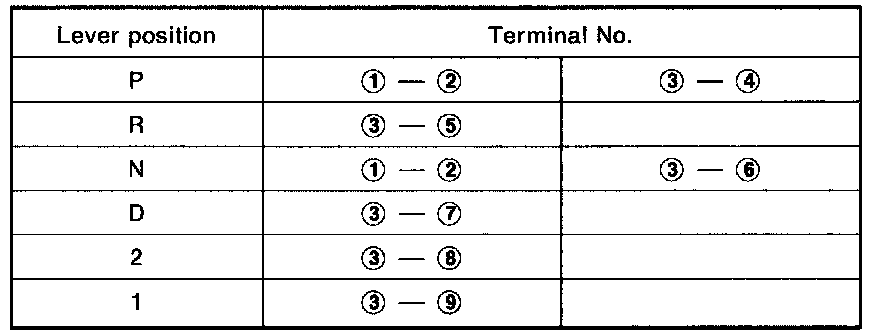 1. Check continuity between terminals (1) and (2) and between terminals (3) and (4), (5), (6), (7), (8), (9) while moving selector lever through each position.