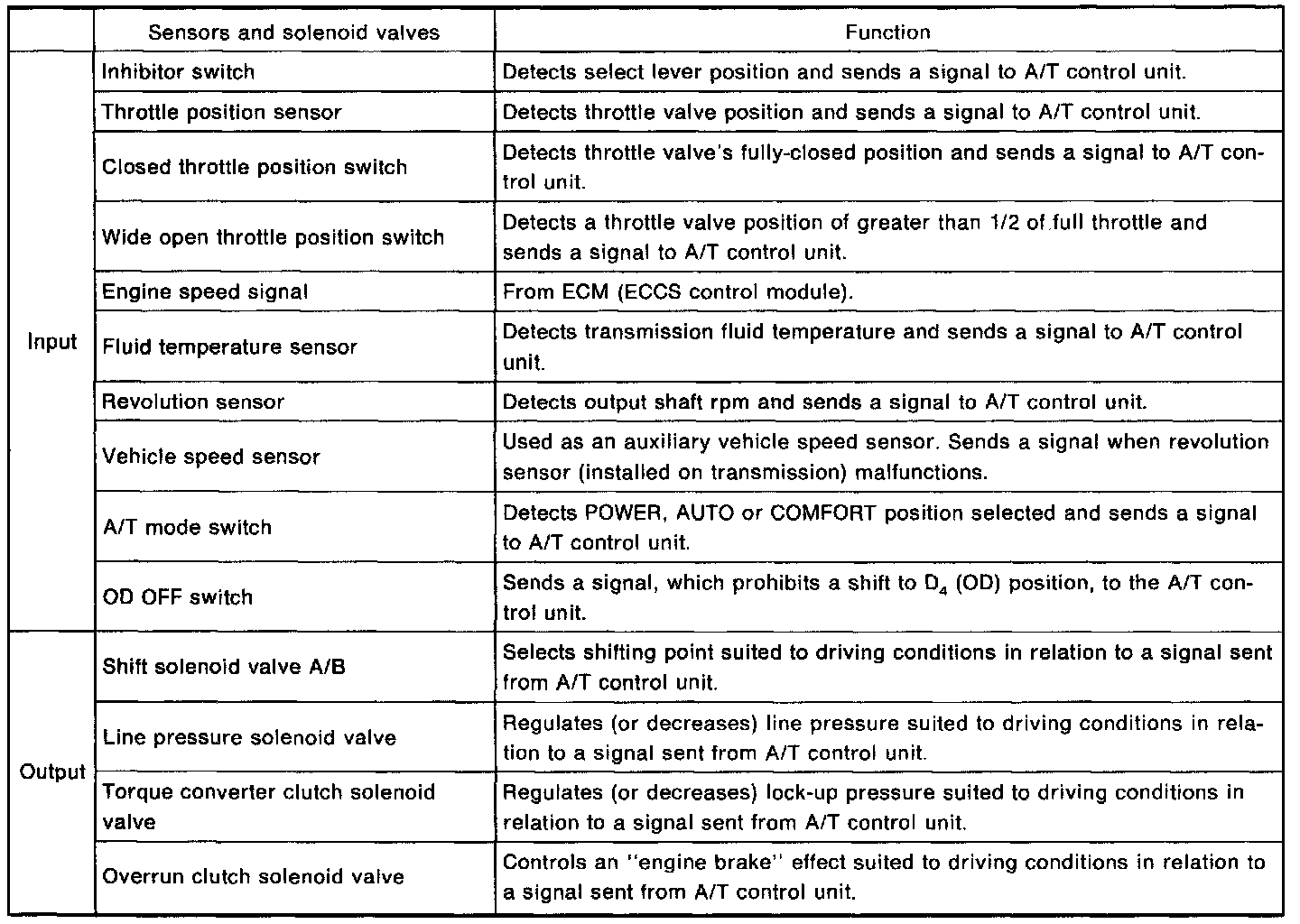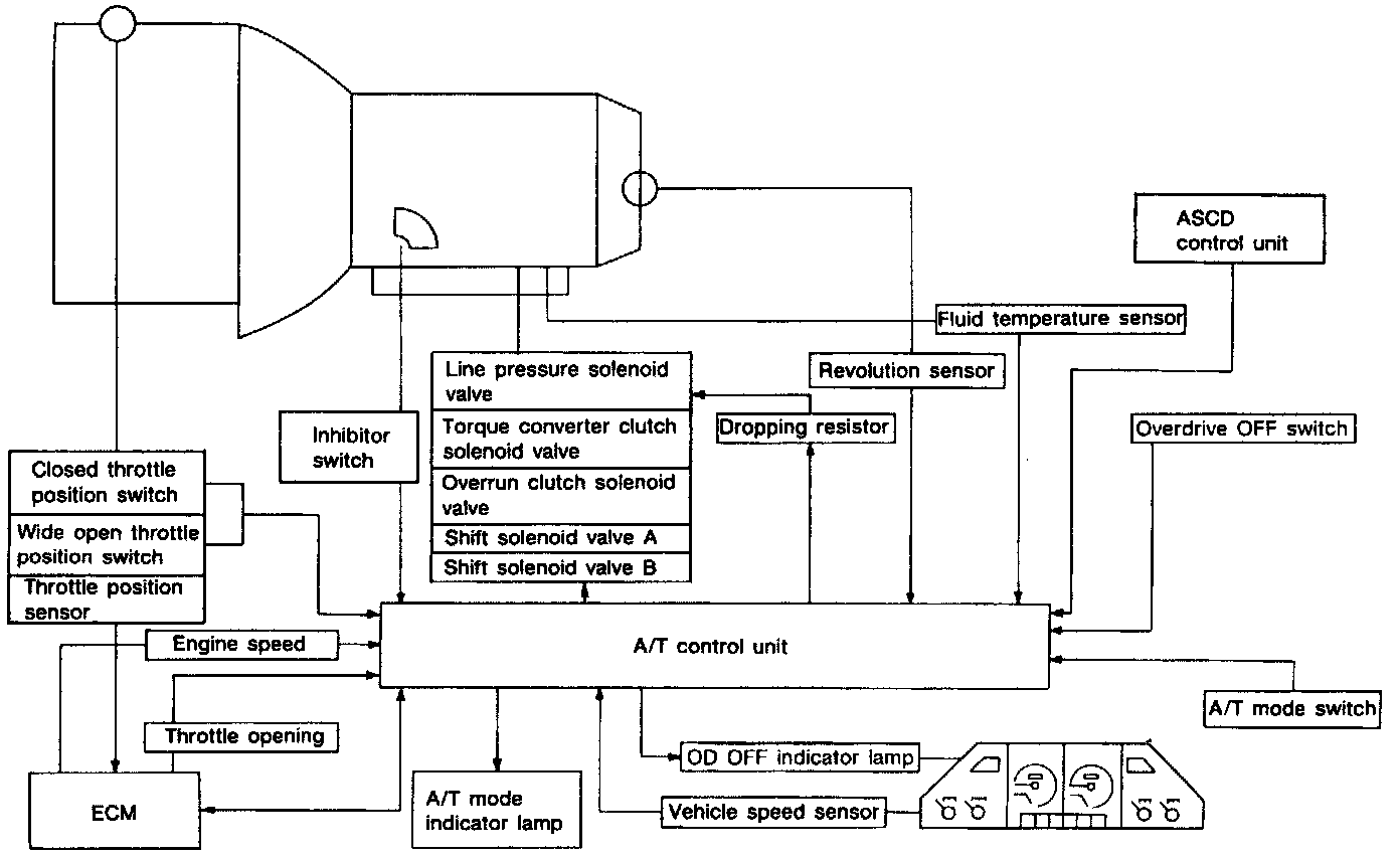 The A/T control unit receives signals sent from various switches and sensors. The control unit then determines required line pressure, shifting point, lock-up operation, engine brake operation. The unit sends required signals to the respective solenoids.