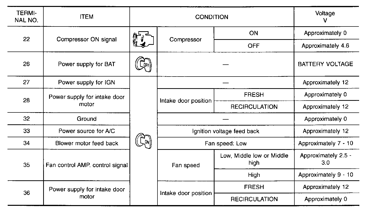 Measure voltage between each terminal and body ground by following "