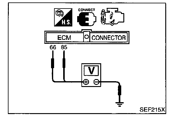 2. Check voltage between ECM terminals 66, 85 and engine ground under the following conditions.