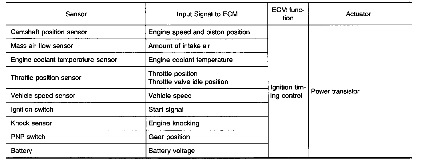 The ECM receives information such as the injection pulse width and camshaft position sensor signal. Computing this information, ignition signals are transmitted to the power transistor.