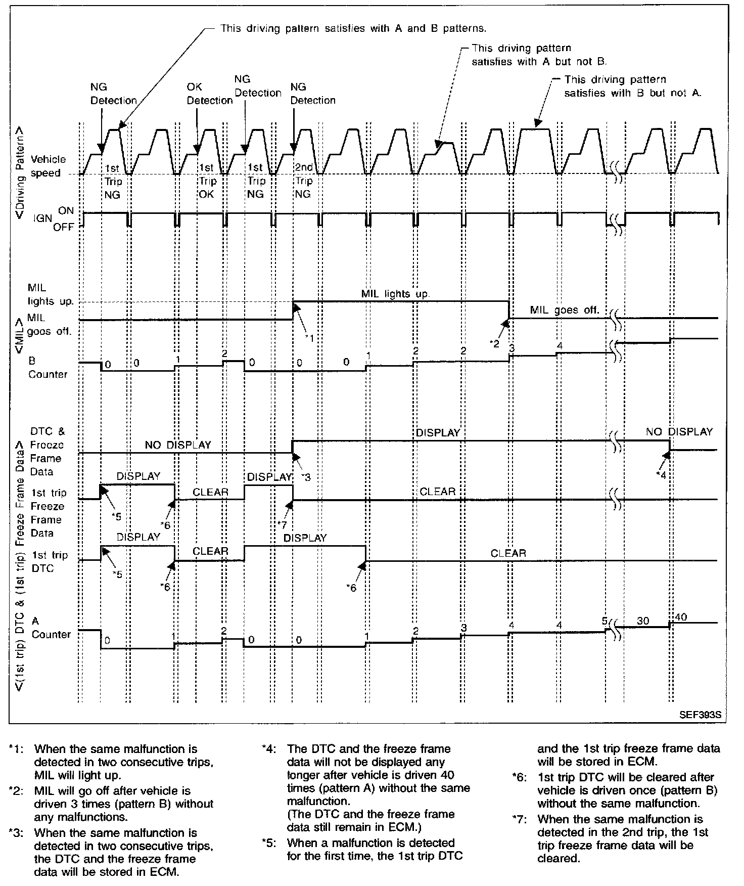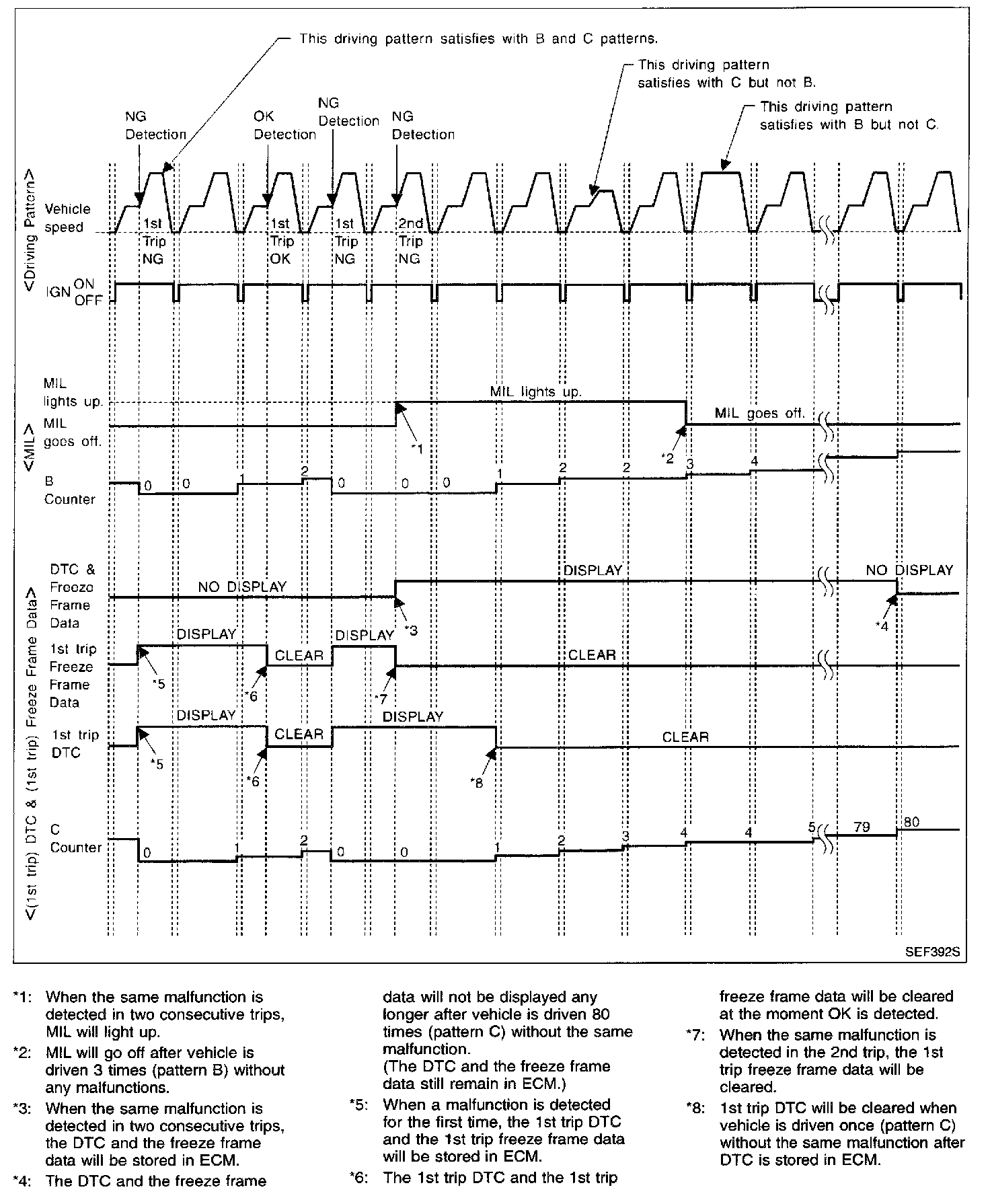 - The DTC and the freeze frame data will be stored until the vehicle is driven 40 times (driving pattern A) without the same malfunction recurring (except for Misfire and Fuel Injection System). For Misfire and Fuel Injection System, the DTC and freeze frame data will be stored until the vehicle is driven 80 times (driving pattern C) without the same malfunction recurring. The "TIME" in "SELF-DIAGNOSTIC RESULTS" mode of CONSULT-II will count the number of times the vehicle is driven.