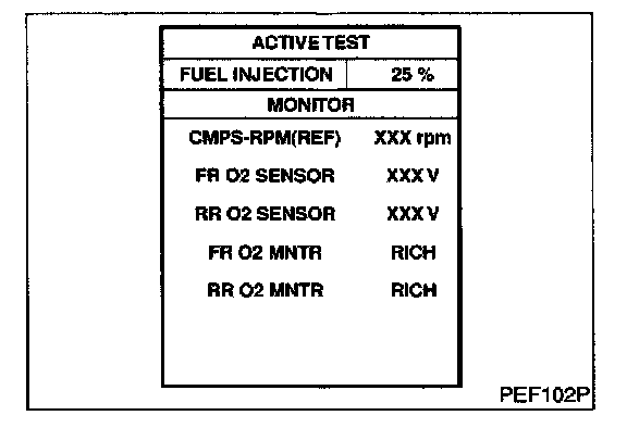 4. Check "RR O2 SEN-B1" at idle speed when adjusting "FUEL INJECTION" to ±25%.