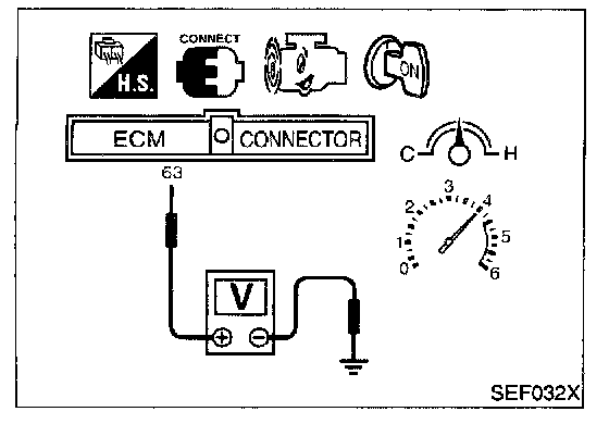 3. Set voltmeter probes between ECM terminals 63 (Rear heated oxygen sensor signal) and engine ground.