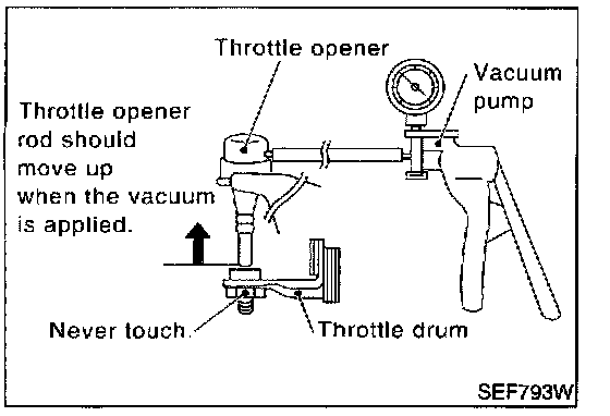 5. Apply vacuum [more than -40.0 kPa (-300 mmHg, 11.81 inHg)] until the throttle drum becomes tree from the rod of the throttle opener.