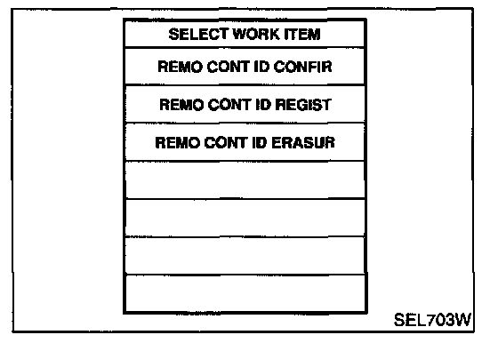 REMOTE CONTROLLER ID SET UP WITH CONSULT-IINOTE: If a remote controller is lost, the ID code of the lost remote controller must be erased to prevent unauthorized use. When the ID code of a lost remote controller is not known, all controller ID codes should be erased. After all ID codes are erased, the ID codes of all remaining and/or new remote controllers must be re-registered.