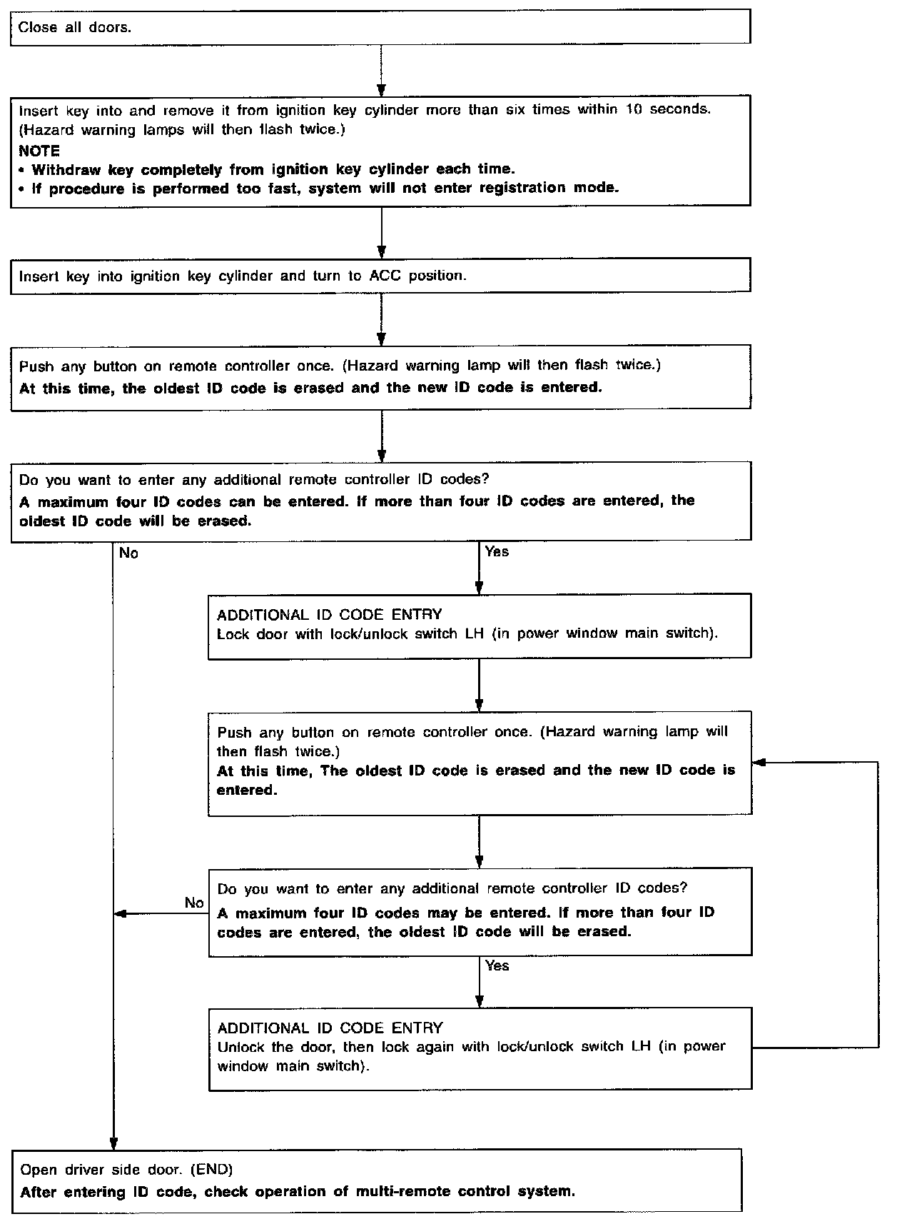 - When registering an additional remote controller, the existing ID codes in memory may or may not be erased. If four ID codes are stored in memory, when an additional code is registered, only the oldest code is erased. If less than four ID codes are stored in memory, when an additional ID code is registered, the new ID code is added and no ID codes are erased.