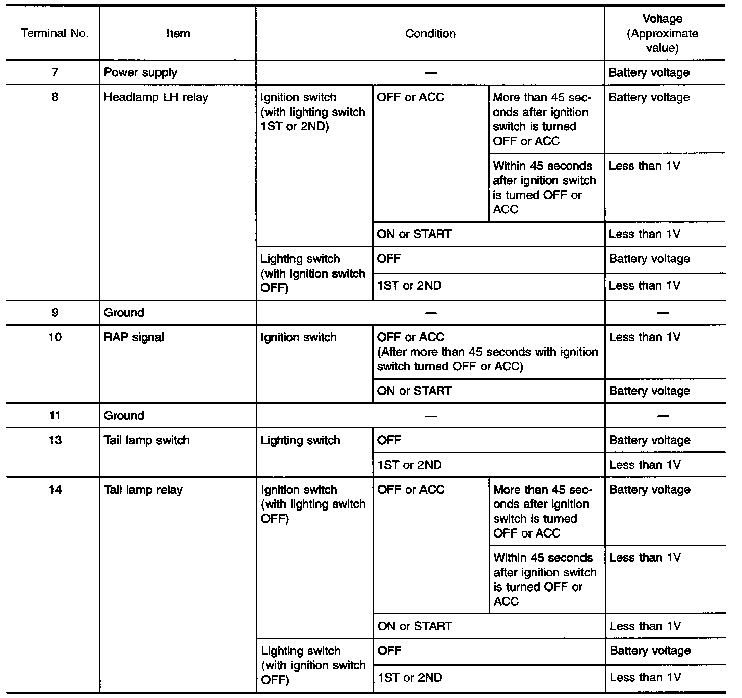 Battery Saver Control Unit Inspection Table (Terminal No. 7 - 14) (USA):