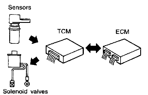 The TCM also communicates with the ECM by means of a signal sent from sensing elements used with the OBD-related parts of the A/T system for malfunction-diagnostic purposes. The TCM is capable of diagnosing malfunctioning parts while the ECM can store malfunctions in its memory.