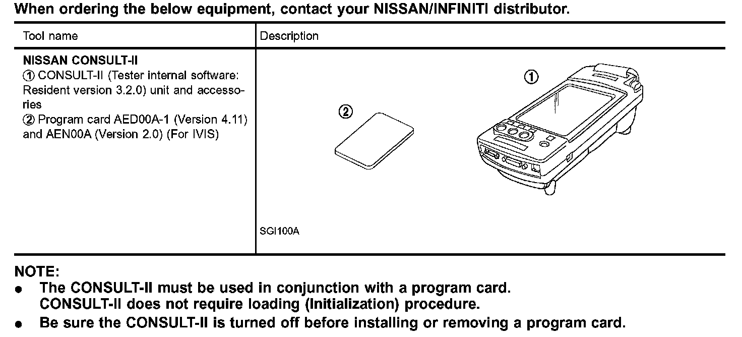 WARNING: Replace the nickel metal hydride battery with Genuine CONSULT-II battery only. Use of another battery may present a risk of fire or explosion. The battery may present a fire or chemical burn hazard if mistreated. Do not recharge, disassemble or dispose of in fire. Keep the battery out of reach of children and discard used battery conforming to the local regulations.