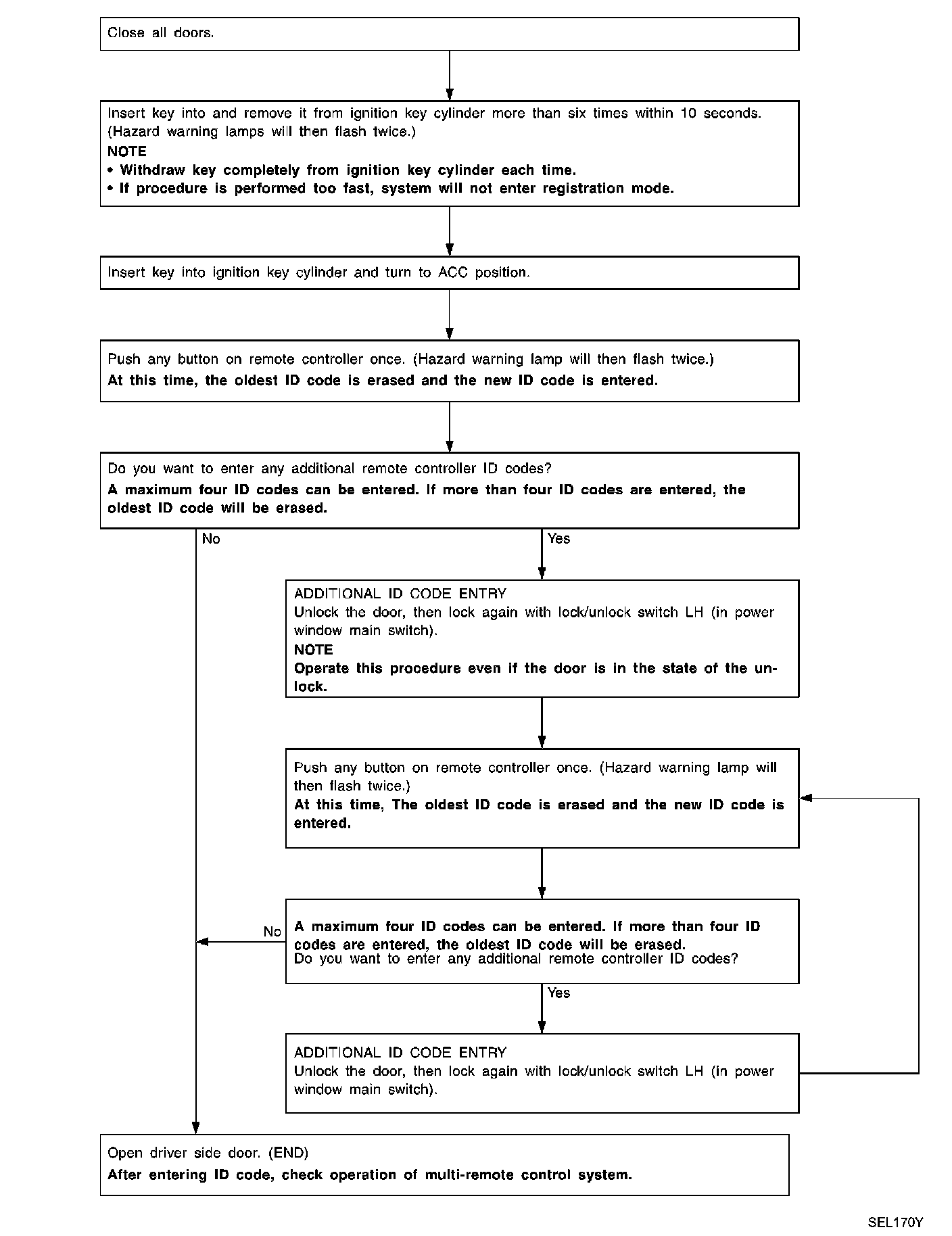 NOTE: If a electronic key is lost, the ID code of the lost electronic key must be erased to prevent unauthorized use. When the ID code of a lost electronic key is not known, all controller ID codes should be erased. After all ID codes are erased, the ID codes of all remaining and/or new remote controllers must be re-registered.