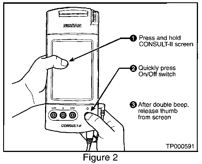 A. While pressing on the CONSULT-II screen with your thumb, quickly depress and release the ON/OFF switch (see Figure 2).