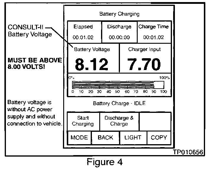 26. After about one minute has passed, check the CONSULT-II's battery voltage reading on the CONSULT-II screen (see Figure 4).