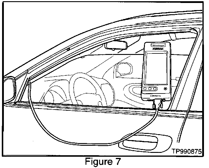 35. Roll down the driver's window part way, exit the vehicle, close the door and hang the CONSULT-II unit on the outside of the window (see Figure 7).
