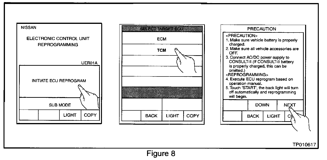 ^ Charge the CONSULT-II battery before proceeding with TCM Reprogramming