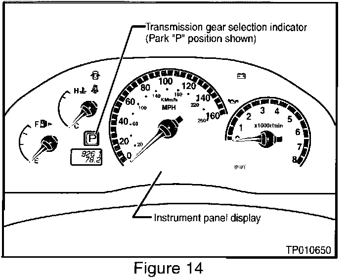 61. Depress the brake pedal and move the shift lever from "P" to "R" to "N" to "D", making sure the indicator next to the speedometer (see Figure 14) correctly displays each selected shift lever position.