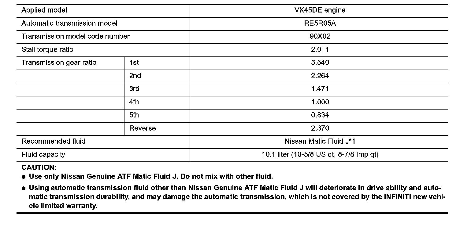 - Using automatic transmission fluid other than Nissan Genuine ATF Matic Fluid J will deteriorate in drive ability and automatic transmission durability, and may damage the automatic transmission, which is not covered by the INFINITI new vehicle limited warranty.