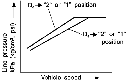 If the selector lever is shifted to 2nd position while driving in D4 (O/D) or D3, great driving force is applied to the clutch inside the transmission. Clutch operating pressure (line pressure) must be increased to deal with this driving force.