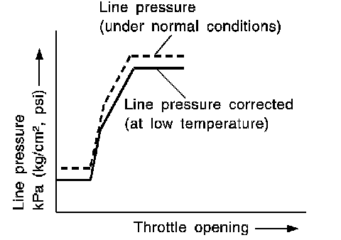 ^ The line pressure is reduced below 60°C (140°F) to prevent shifting shock due to low viscosity of automatic transmission fluid when temperature is low.