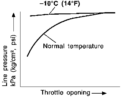 ^ Line pressure is increased to a maximum irrespective of the throttle opening when fluid temperature drops to -10°C (14°F). This pressure rise is adopted to prevent a delay in clutch and brake operation due to extreme drop of fluid viscosity at low temperature.
