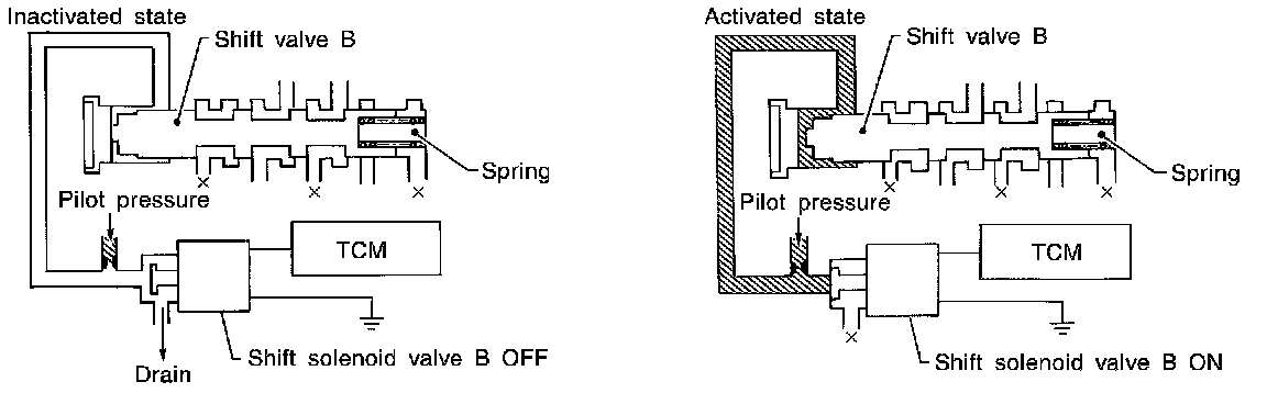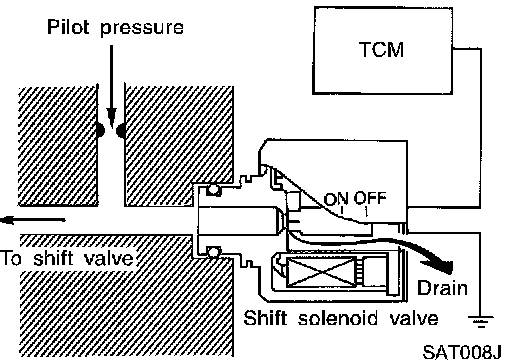 The shift solenoid valve performs simple ON-OFF operation. When set to ON, the drain circuit closes and pilot pressure is applied to the shift valve.