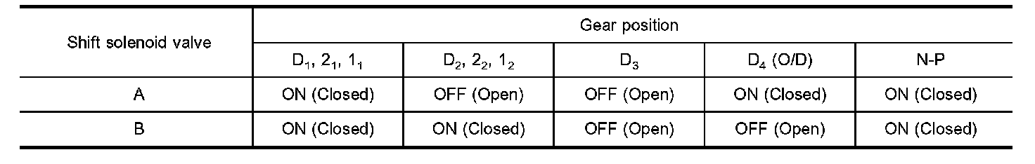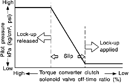The torque converter clutch piston in the torque converter is locked to eliminate torque converter slip to increase power transmission efficiency. The solenoid valve is controlled by an ON-OFF duty signal sent from the TCM. The signal is converted to an oil pressure signal which controls the lock-up piston.
