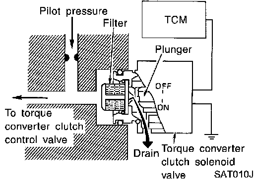 The torque converter clutch solenoid valve is controlled by the TCM. The plunger closes the drain circuit during the OFF period, and opens the circuit during the ON period. If the percentage of OFF-time increases in one cycle, the pilot pressure drain time is reduced and pilot pressure remains high.