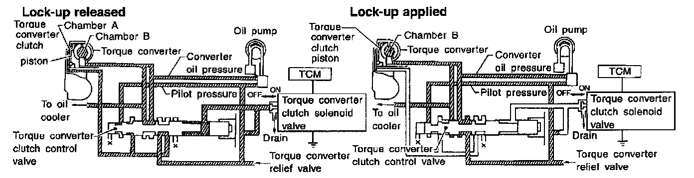 The OFF-duration of the torque converter clutch solenoid valve is long, and pilot pressure is high. The pilot pressure pushes the end face of the torque converter clutch control valve in combination with spring force to move the valve to the left. As a result, converter pressure is applied to chamber A (torque converter clutch piston release side). Accordingly, the torque converter clutch piston remains unlocked.