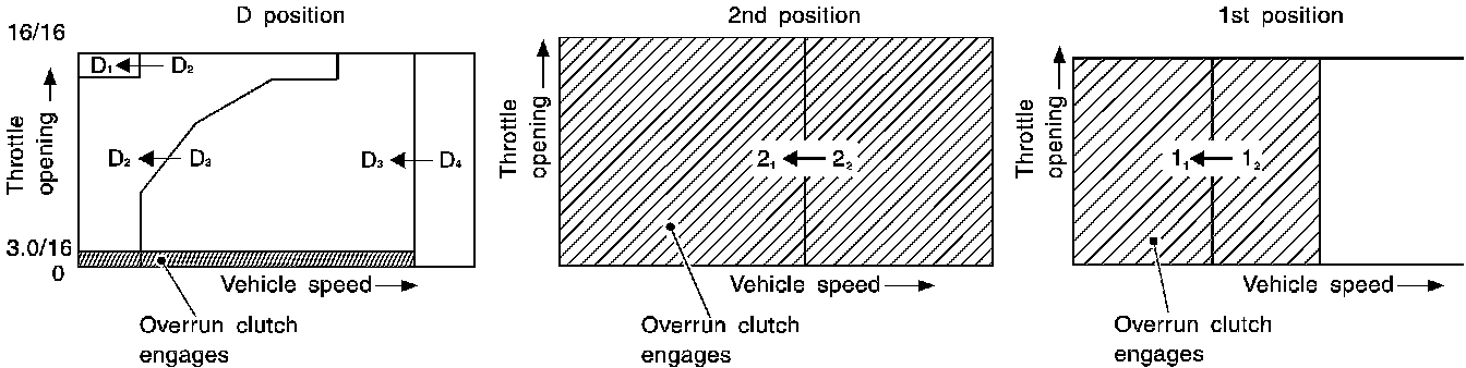 The shift is regulated entirely by electronic control to accommodate vehicle speed and varying engine operations. This is accomplished by electrical signals transmitted by the revolution sensor and throttle position sensor. This results in improved acceleration performance and fuel economy.