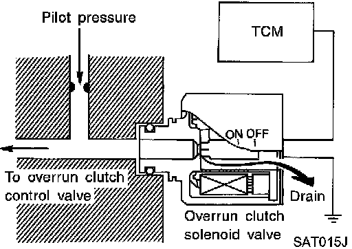 The overrun clutch solenoid valve is operated by an ON-OFF signal transmitted by the TCM to provide overrun clutch control (engine brake control).