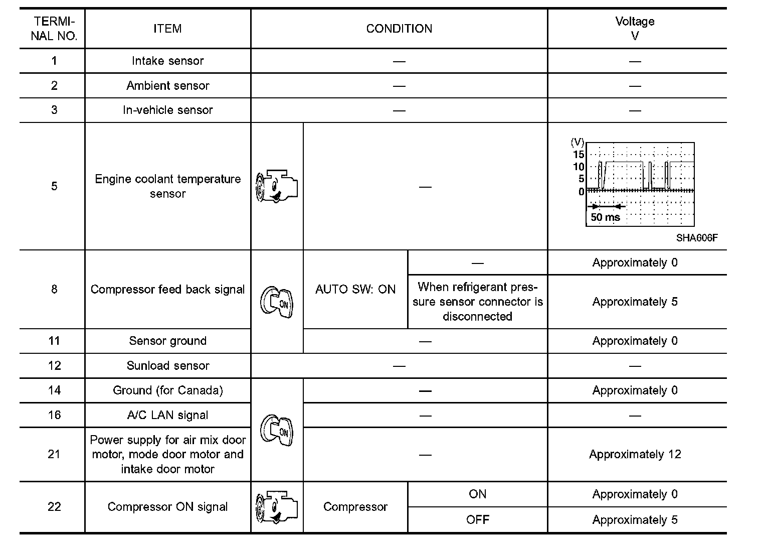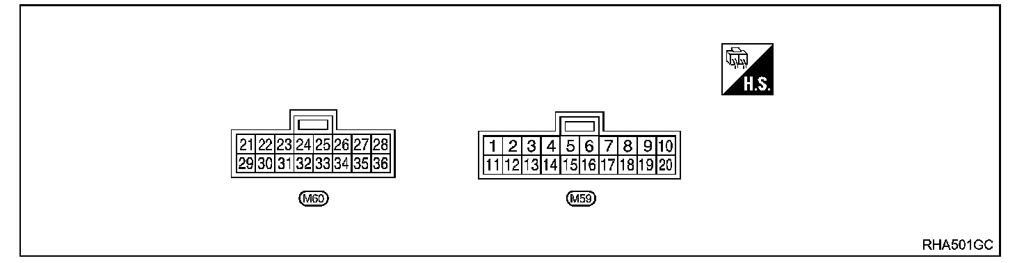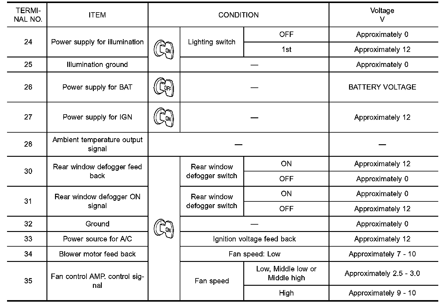 Measure voltage between each terminal and body ground by following "AUTO AMP. INSPECTION TABLE".