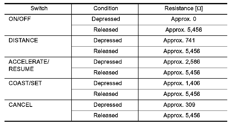 Check resistance between ICC steering switch terminals 1 and 2 by depressing each switch.