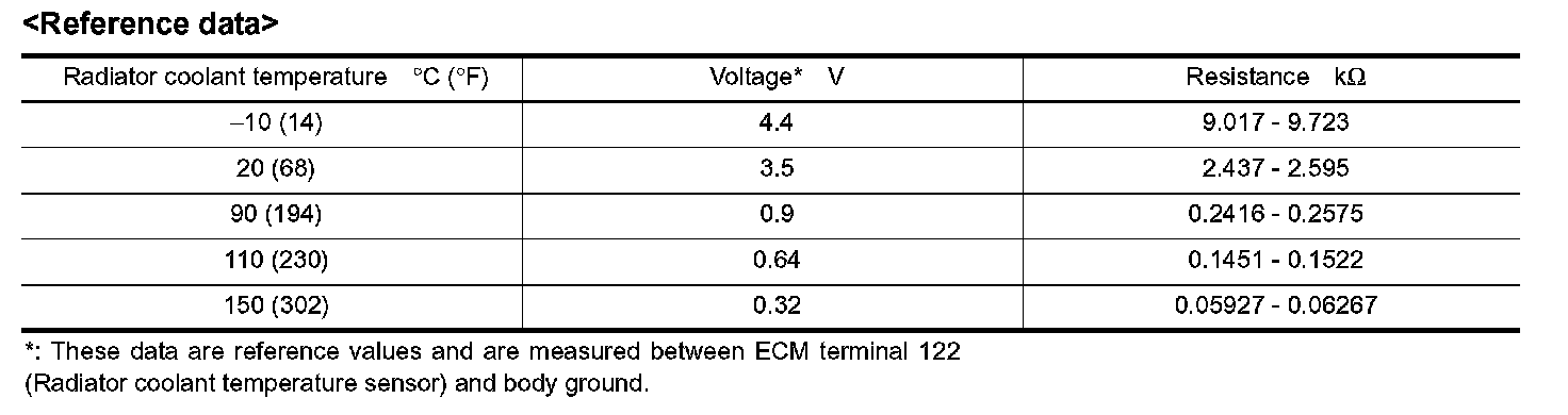 The radiator coolant temperature sensor is installed on the radiator lower tank and used to detect the radiator coolant temperature. The sensor modifies a voltage signal from the ECM and returns the modified signal to the ECM as the radiator coolant temperature input. The sensor uses a thermistor which is sensitive to the change in temperature. The electrical resistance of thermistor decreases as temperature increase. The ECM uses this signal to control the cooling fan speed control solenoid valve.