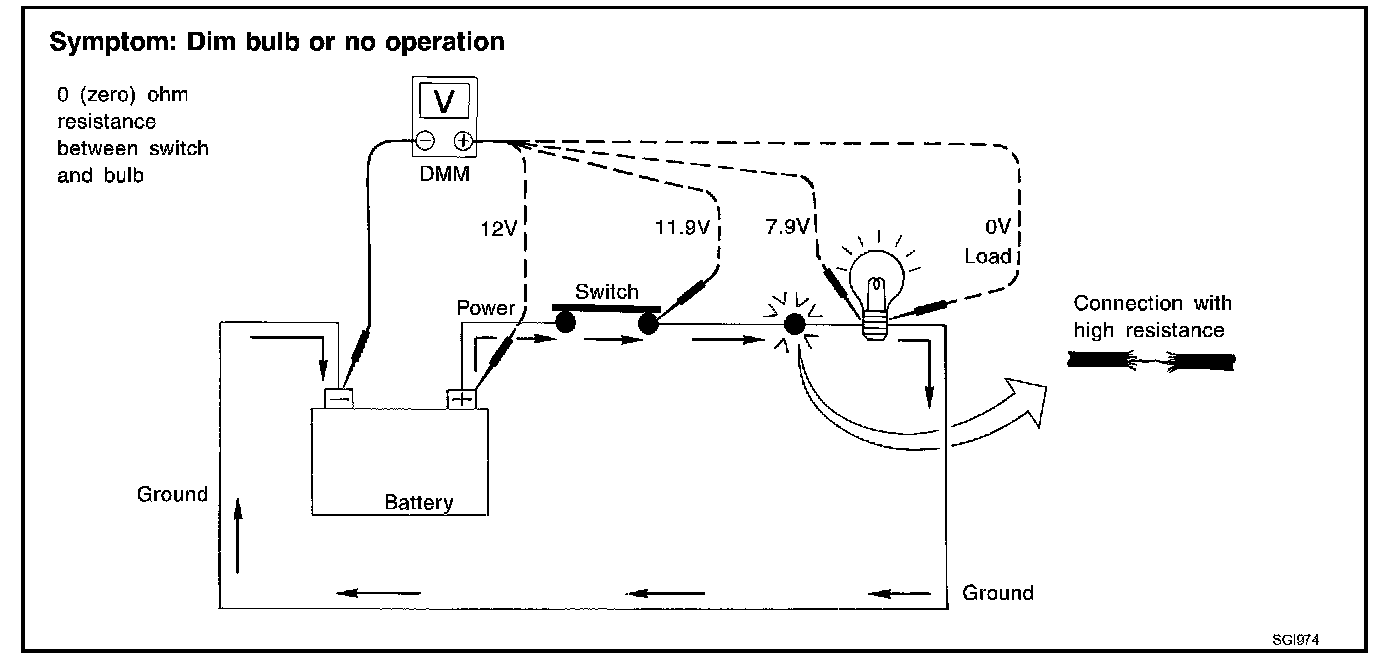 Check the wire in the illustration. When measuring resistance with DMM, contact by a single strand of wire will give reading of 0 ohms. This would indicate a good circuit. When the circuit operates, this single strand of wire is not able to carry the current. The single strand will have a high resistance to the current. This will be picked up as a slight voltage drop.