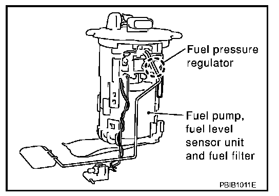 The fuel level sensor is mounted in the fuel level sensor unit. The sensor detects a fuel level in the fuel tank and transmits a signal to the ECM.