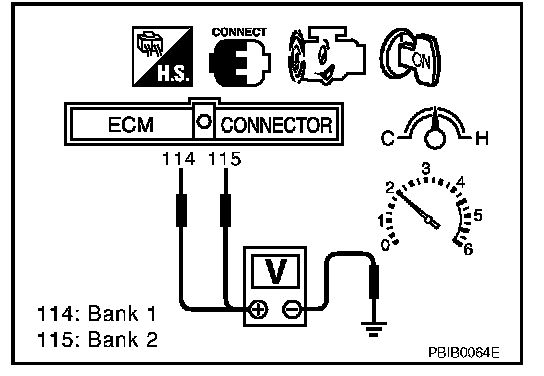 2. Set voltmeter probes between ECM terminal 114 [HO2S1 (B1) signal] or 115 [HO2S1 (B2) signal] and engine ground.