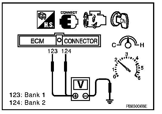 5. Set voltmeter probes between ECM terminal 123 [HO2S2 (B1) signal] or 124 [HO2S2 (B2) signal] and engine ground.