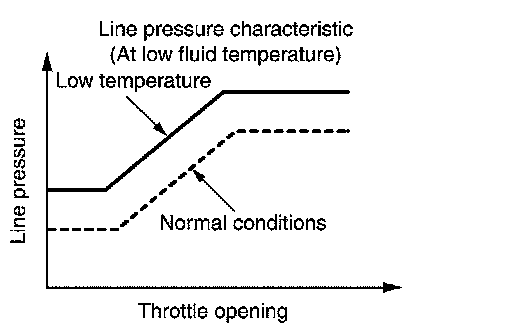 When the A/T fluid temperature drops below the prescribed temperature, in order to speed up the action of each friction element, the line pressure is set higher than the normal line pressure characteristic.