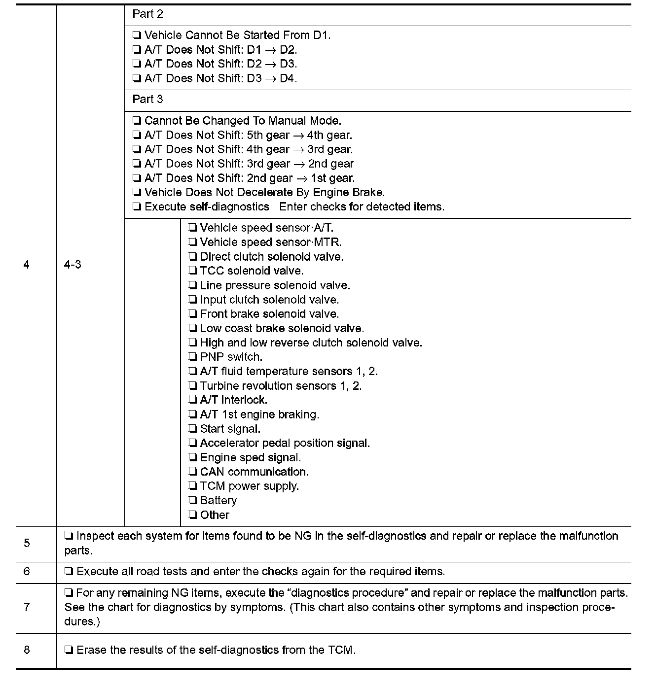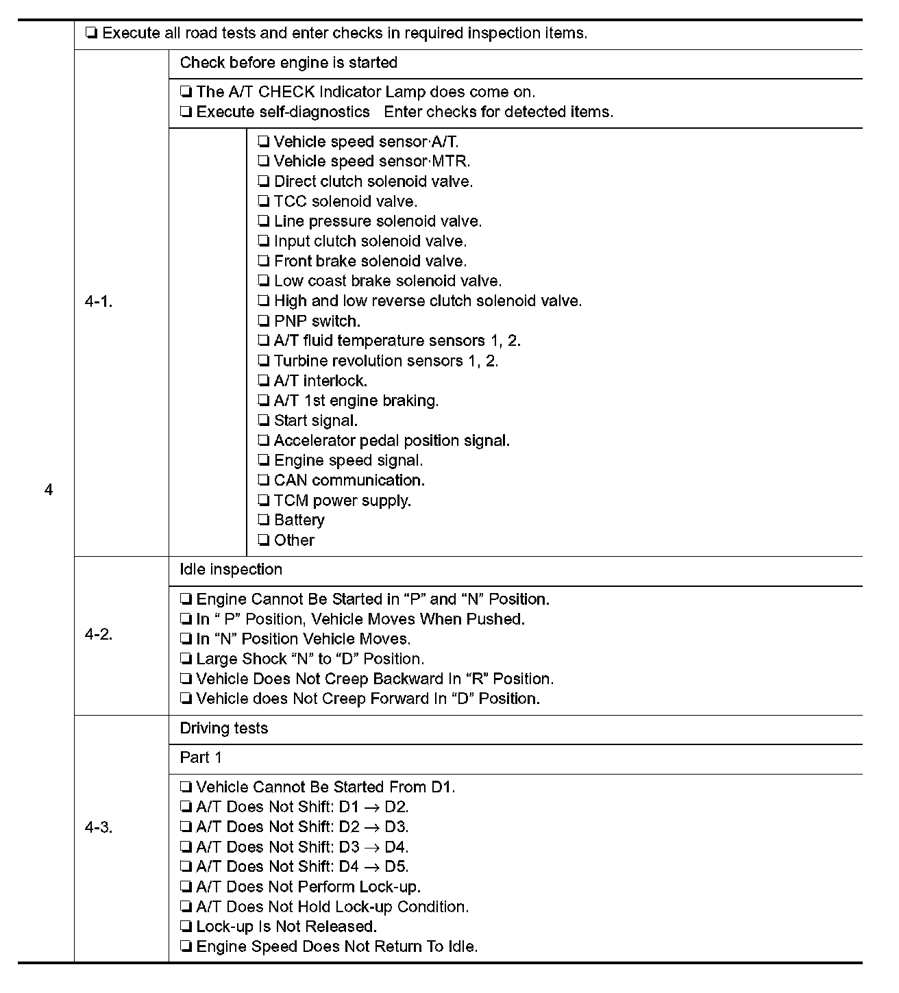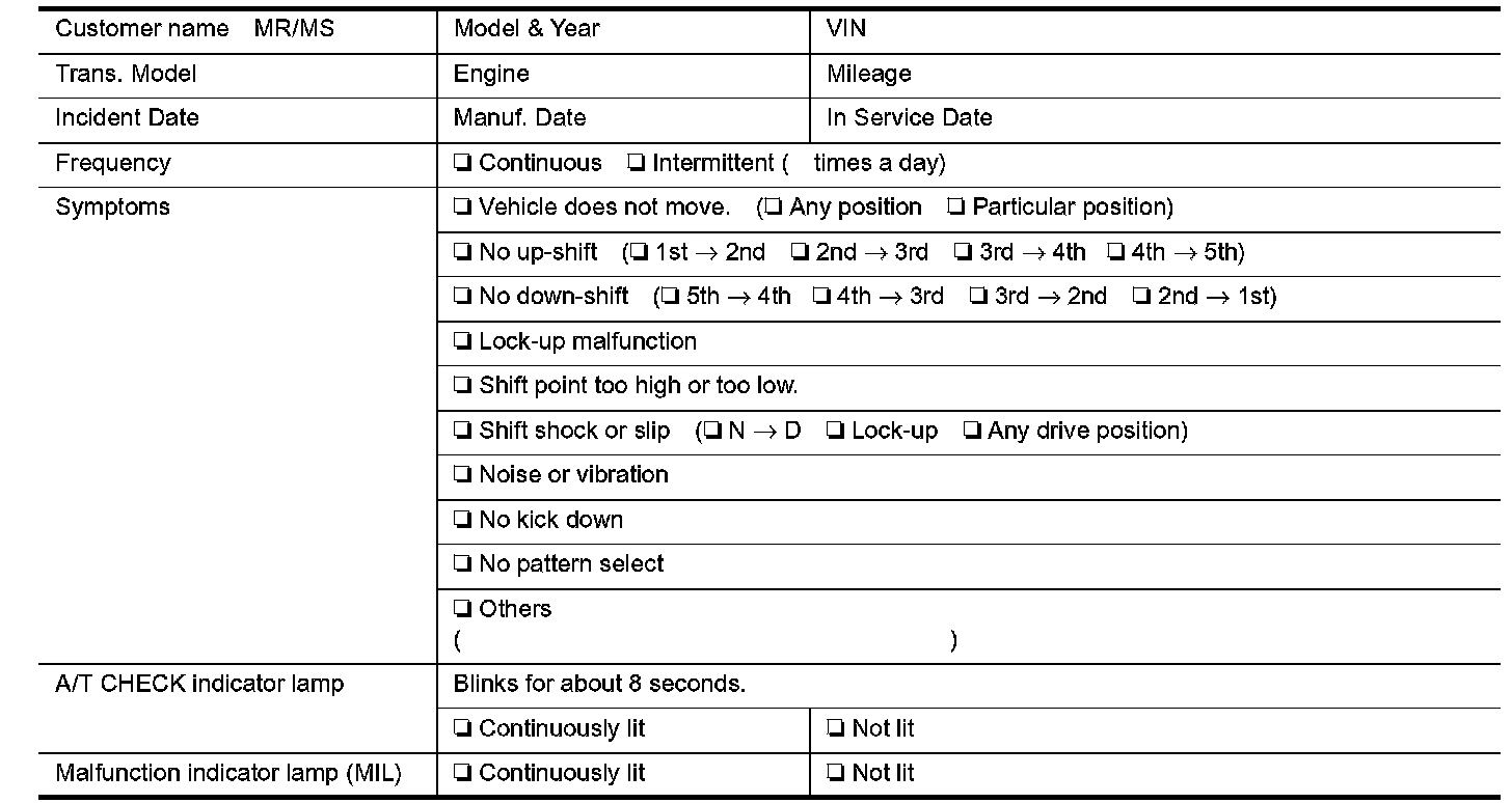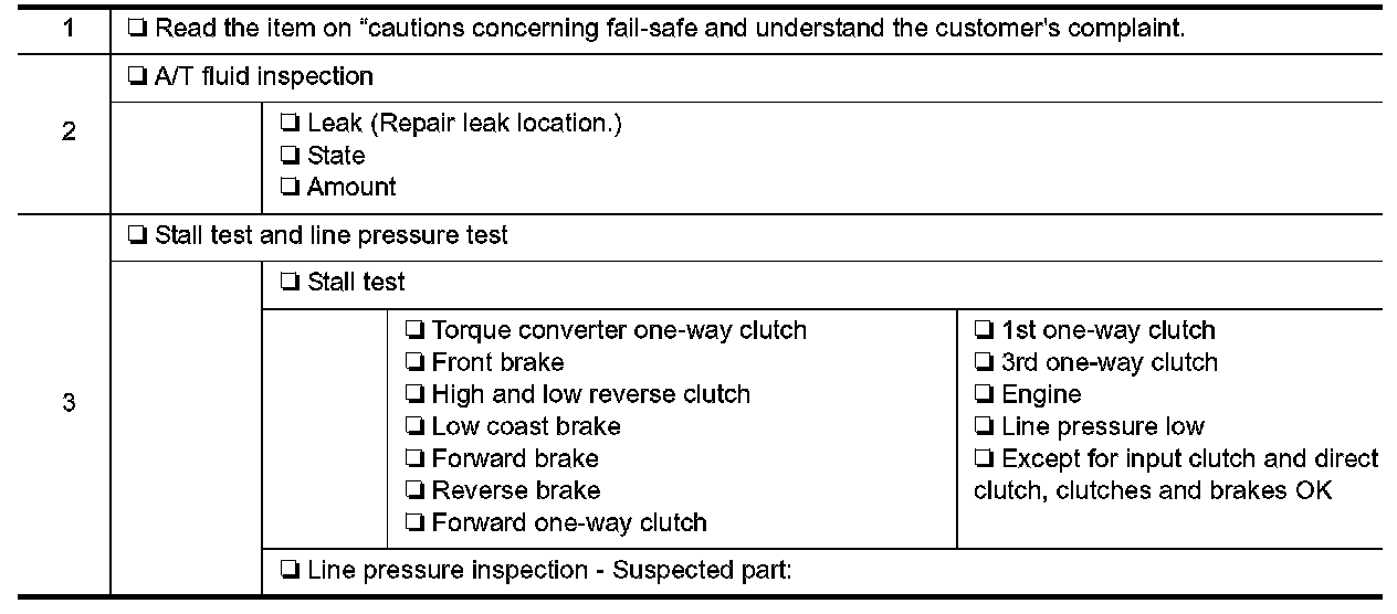 Input and output signals must always be correct and stable in the operation of the A/T system. The A/T system must be in good operating condition and be free of valve seizure, solenoid valve malfunction, etc.