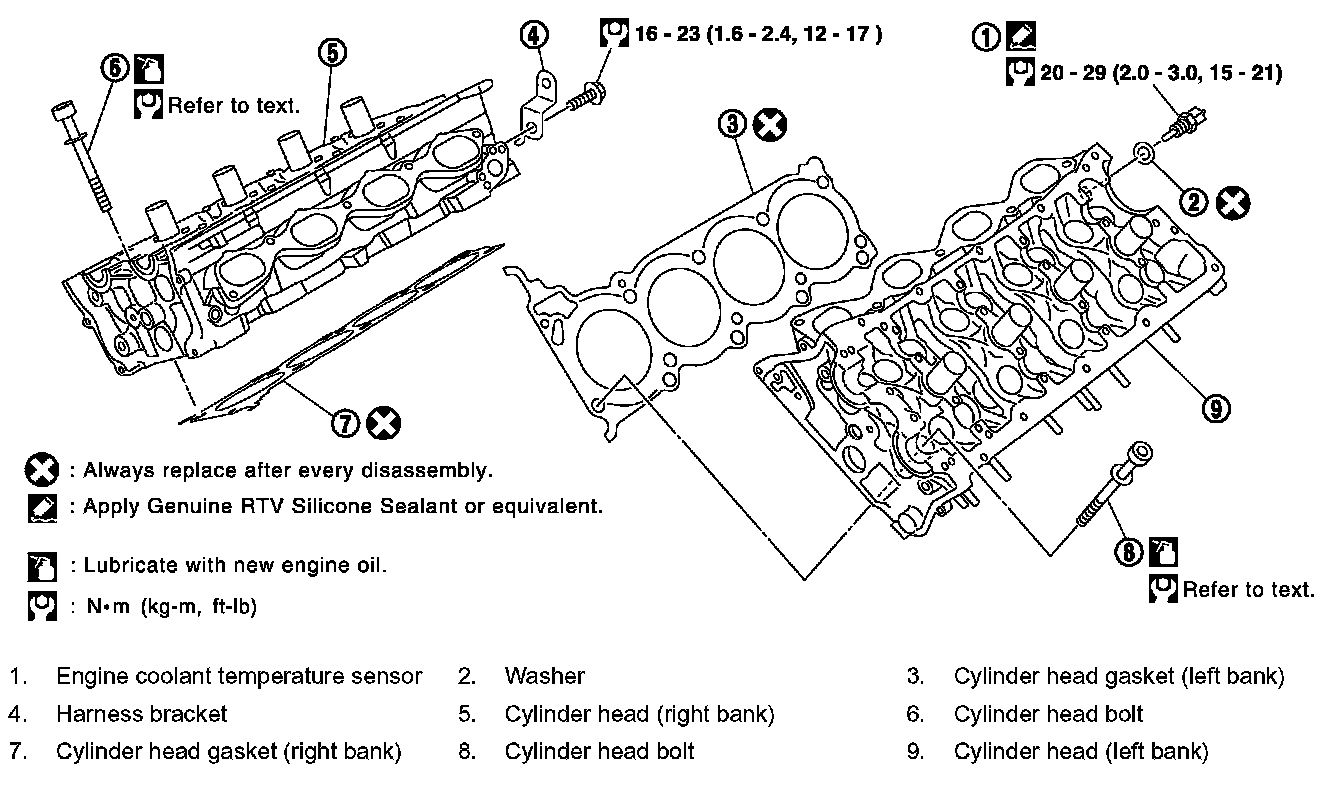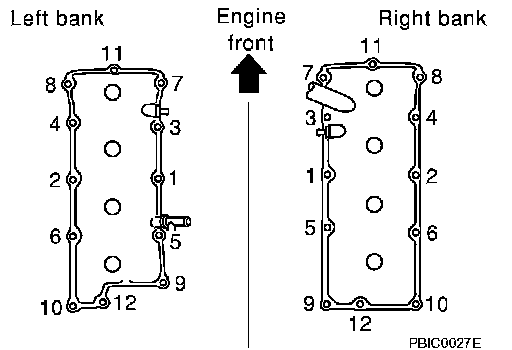 CAUTION: If cylinder head bolts are re-used, check their outer diameters before installation. Refer to "Outer Diameter of Cylinder Head Bolts".