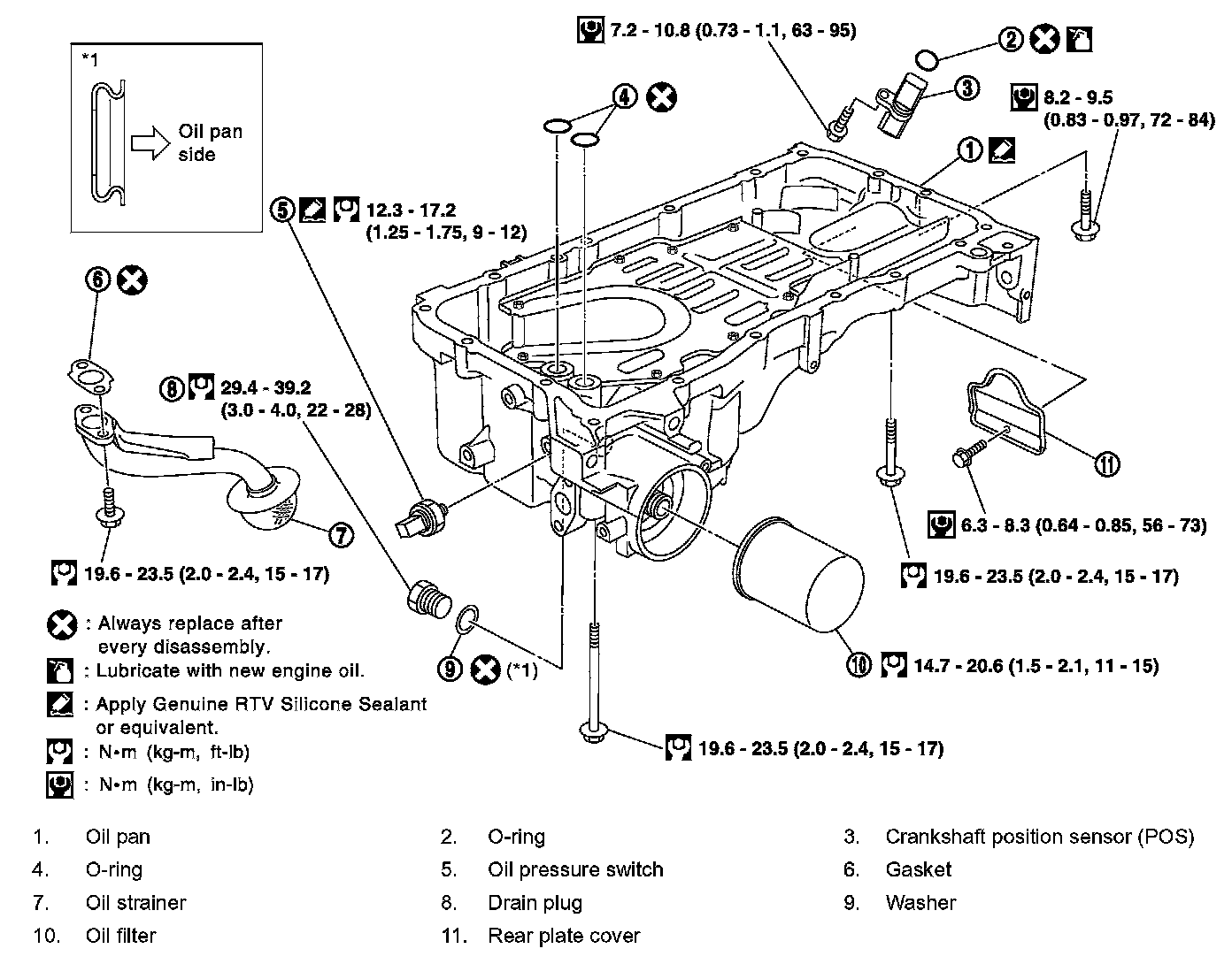 Oil pan drain plug 29.4 - 39.2 Nm (3.0 - 4.0 kg-m, 22 - 28 ft. lbs.)