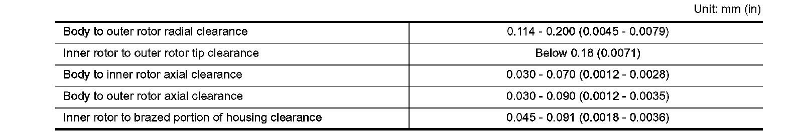Inner rotor to brazed portion of housing clearance 0.045 - 0.091 mm (0.0018 - 0.0036 inch)